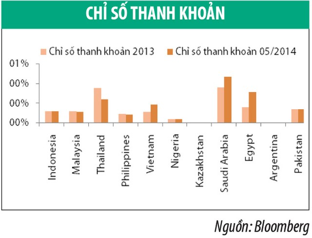 Một yếu tố khác không kém quan trọng là chỉ tiêu thanh khoản (% giá trị giao dịch/vốn hóa thị trường) của Việt Nam đã có một sự cải thiện quan trọng. Tính đến hết 5 tháng, chỉ số này của VN-Index là 1,8%, tăng đến 69% so với năm 2013, chứng tỏ TTCK Việt Nam đã được dòng vốn (trong nước và cả nước ngoài) quan tâm hơn rất nhiều. Con số tăng trưởng này cũng chỉ thua kém Case của Ai cập với sự bùng nổ giao dịch trong các tháng đầu năm nay.