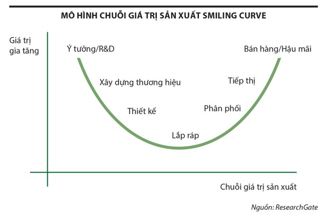 Theo mô hình Smiling Curve (do ông Stan Shih, Chủ tịch hãng máy tính Acer phát triển năm 1992), các doanh nghiệp Việt Nam tập trung ở công đoạn lắp ráp (manufacturing) - vốn tạo ra giá trị gia tăng thấp. Công đoạn này đòi hỏi lao động cường độ cao, tức là vốn trên mỗi lao động thấp. Doanh nghiệp gia công lắp ráp phải đối mặt với các yêu cầu khắt khe từ nhà cung cấp nguyên liệu và nhà phân phối, thương hiệu, làm suy yếu khả năng đàm phán trong chuỗi giá trị.