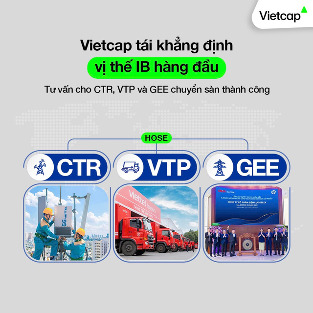 Phát huy lợi thế AM TƯỜNG TÀI CHÍNH cũng như nắm chắc, hiểu rõ các quy trình thủ tục đối với công ty đại chúng và IPO/niêm yết/chuyển sàn niêm yết, Vietcap không chỉ giúp doanh nghiệp huy động vốn mà còn góp phần vào công cuộc đưa thêm hàng hoá đa dạng, chất lượng trên thị trường chứng khoán. Thương vụ gần nhất (ngay trước GEE) là VTP (3/2024) và CTR (2022).