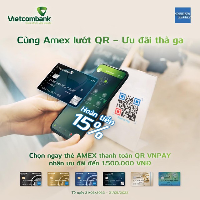 Thời gian từ ngày 21/02/2022 đến ngày 21/05/2022 tại các đơn vị chấp nhận thanh toán QR của VNPAY, khách hàng sử dụng thẻ tín dụng Vietcombank thương hiệu American Express để thanh toán hàng hóa dịch vụ qua hình thức Thanh toán QR trên Ứng dụng VCB Digibank tại đơn vị chấp nhận thanh toán của VNPAY sẽ được ưu đãi: Hoàn tiền 15% tổng doanh số chi tiêu hợp lệ, doanh số chi tiêu hợp lý tối thiểu: 500.000 VNĐ, số tiền hoàn tối đa cho 1 khách hàng là 1.500.000 VNĐ.