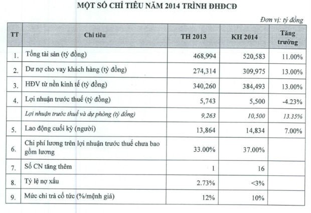 Vietcombank lên kế hoạch đạt 5.500 tỷ đồng lợi nhuận trước thuế, giảm 4,23% so với thực hiện năm 2013. Vì dự kiến lợi nhuận sẽ sụt giảm nên HĐQT đề xuất mức cổ tức là 10%, giảm 2% so với năm trước. Lợi nhuận trước thuế và dự phòng rủi ro sẽ tăng 13,35%, lên 10.500 tỷ đồng. Tỷ lệ nợ xấu phấn đấu tiếp tục ở mức dưới 3%.