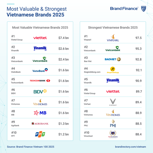 Năm 2025, giá trị thương hiệu của Vietcombank được Brand Finance định giá đạt 2,4 tỷ USD, tăng 16% so với năm trước. Thành tích này đưa Vietcombank vươn lên vị trí thứ 3 trong Top 100 thương hiệu Việt Nam, vượt qua nhiều doanh nghiệp lớn ở các lĩnh vực bất động sản, công nghệ, hàng tiêu dùng.