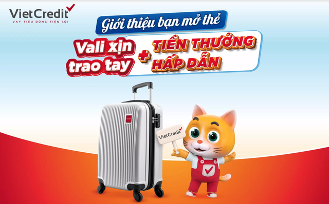 Đây là một ưu đãi hấp dẫn không nên bỏ lỡ dịp này, bởi khách hàng ngoài được tặng vali, còn được nhận tiền thưởng là 150 ngàn đồng/người khi giới thiệu thành công từ 1-5 người mới mở thẻ vay, từ người thứ 6 trở đi, tiền thưởng lên đến 300 ngàn đồng/người và VietCredit không giới hạn số lượng người được giới thiệu. Giới thiệu thành công càng nhiều thì số tiền thưởng nhận được càng cao.