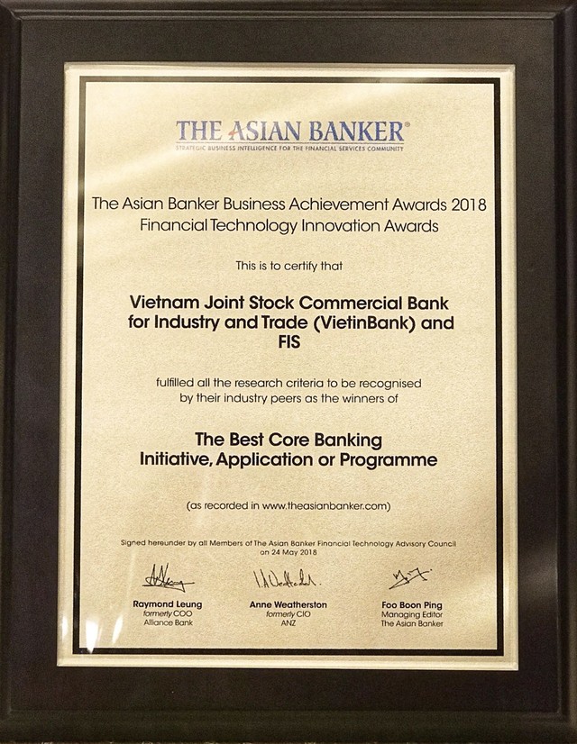 Giấy khen giải thưởng "Chương trình đổi mới Core Banking tốt nhất" của VietinBank.