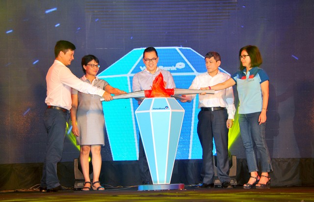 Đại diện Ban Lãnh đạo VietinBank thực hiện nghi thức châm đuốc, truyền lửa ra mắt thẻ Visa Debit Sống Khỏe