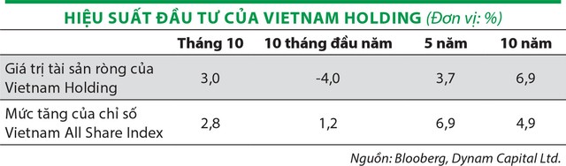Dù vậy, tính từ đầu năm tới cuối tháng 10, hiệu suất đầu tư của Vietnam Holding là -4%, trong khi chỉ số Vietnam All Share tăng 1,2%.