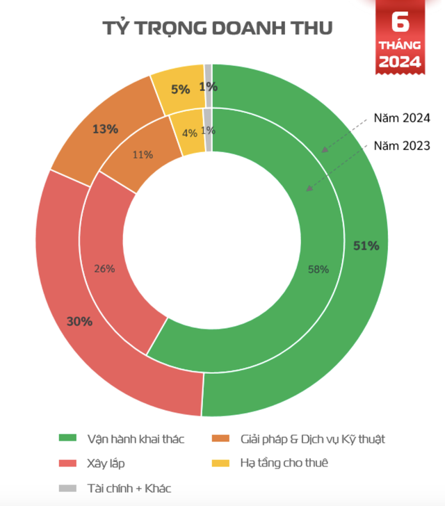 Xét về cơ cấu doanh thu, mảng vận hành khai thác mang về 2.880 tỷ đồng, chỉ tăng nhẹ so với cùng kỳ nhưng chiếm tỷ trọng lớn nhất trong tổng doanh thu với 51%. Mảng xây lắp tăng trưởng 39%, đạt 1.731 tỷ đồng, chiếm 30%. Mảng giải pháp và dịch vụ kỹ thuật tăng 35%, đạt 717,9 tỷ đồng, chiếm 13%. Còn lại mảng hạ tầng cho thuê cũng tăng 39%, đạt 282,5 tỷ đồng, chiếm 5% doanh thu.