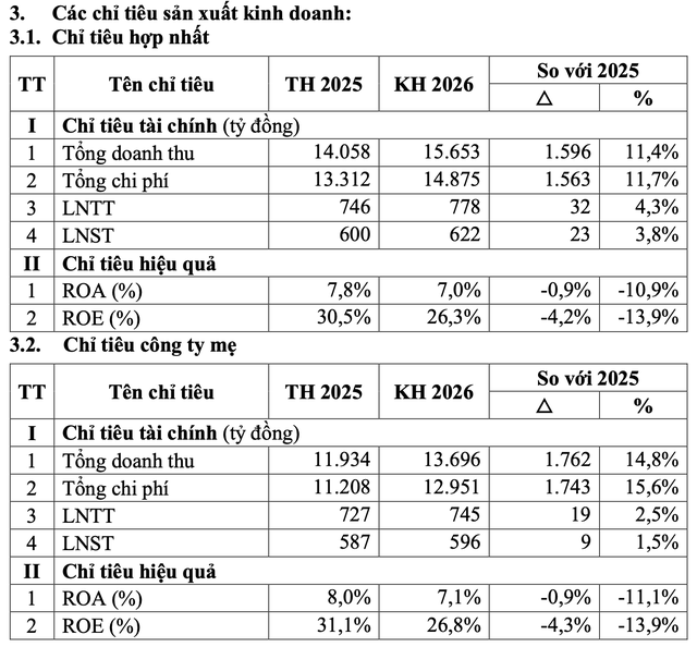 Năm 2026, Công ty đặt mục tiêu tổng doanh thu đạt 15.653 tỷ đồng, tăng 11% so với năm trước. Theo đó, lợi nhuận sau thuế đạt 622,4 tỷ đồng, tăng 3,8%. Trong đó, tổng doanh thu của Công ty mẹ đạt 13.696 tỷ đồng và lợi nhuận sau thuế 596 tỷ đồng; ROE đạt 26,8%.