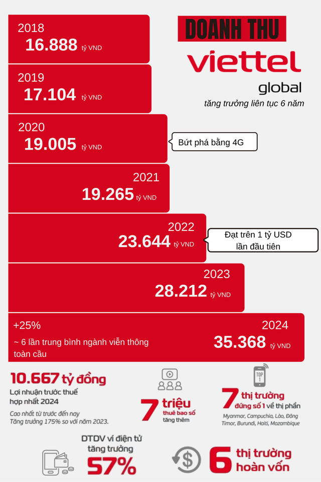 Kết quả kinh doanh năm 2024 của Viettel Global ghi nhận những điểm sáng nổi bật. Doanh thu hợp nhất của Tổng công ty đạt 35.368 tỷ đồng, tăng trưởng 25% so với năm 2023. Mức tăng này gấp 6 lần mức tăng trưởng trung bình của ngành viễn thông toàn cầu (theo GSMA Intelligence). Như vậy, Viettel Global đạt gần 100 tỷ đồng doanh thu mỗi ngày.