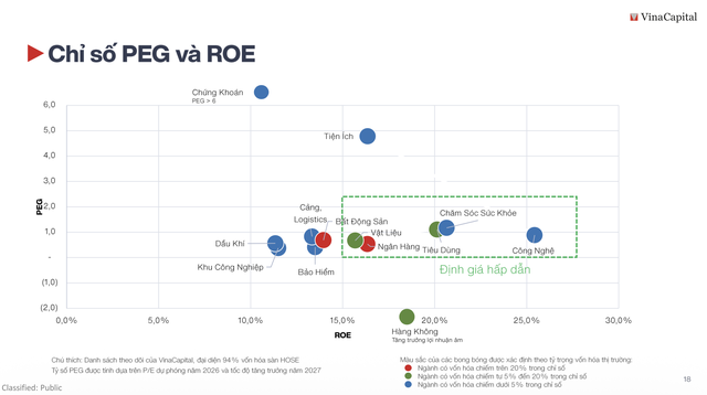 Các ngành đang được định giá tương đối rẻ dựa trên tiêu chí PEG thấp hơn 1 và ROE đòi hỏi từ 15% trở lên bao gồm:Vật liệu, ngân hàng, tiêu dùng, chăm sóc sức khỏe, công nghệ. Trong đó, ngành công nghệ đã bị giảm mạnh lợi nhuận trong năm 2025 (là ngành duy nhất bị giảm tới 20 - 25%), trở nên "khá là đẹp và hấp dẫn về mặt định giá" hiện tại.