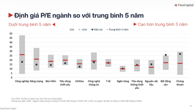 Ngoài ra, nhiều ngành chưa thực sự tăng trưởng hiệu suất tốt từ đầu năm (như năng lượng, bảo hiểm, tiêu dùng thiết yếu) đang có mức định giá thấp hơn đáng kể so với trung bình 5 năm lịch sử của chúng. Ngược lại, bất động sản và chứng khoán đang ở mức đắt hơn so với bình quân quá khứ.