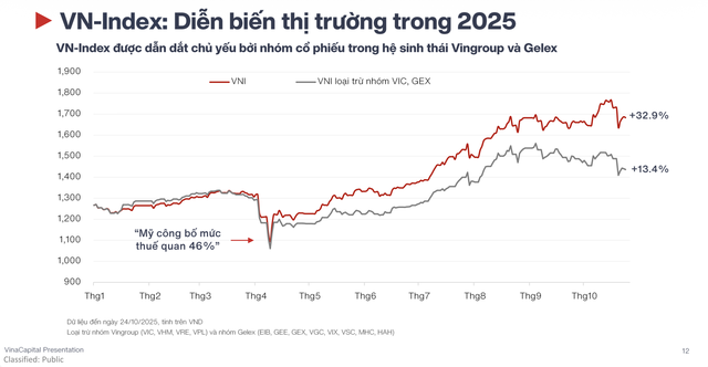 Xét về định giá, dù VN-Index đã tăng ấn tượng 33% từ đầu năm (tính đến 24/10), sau khi phục hồi 50% từ đáy tạo ra khi Mỹ công bố thuế quan vào đầu tháng 4/2024, thì sự tăng trưởng này "rất thiếu đồng đều" và được dẫn dắt bởi một nhóm nhỏ, chỉ khoảng 13 cổ phiếu (như nhóm Vingroup và Gelex), trong khi phần còn lại của thị trường thực chất chỉ tăng 13,4%.