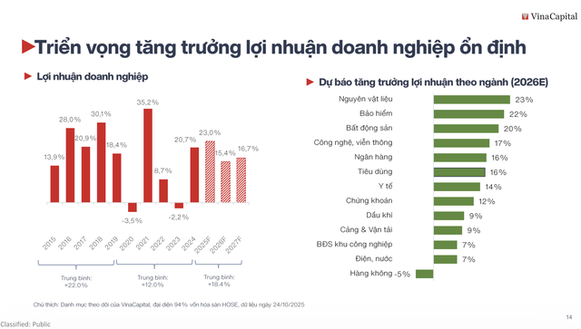 Theo bà Thu, nếu tạm bỏ 13 cổ phiếu đã tăng nóng ra khỏi rổ chỉ số, thì P/E dự phóng 12 tháng chỉ khoảng 10,5 lần (lợi nhuận doanh nghiệp dự phóng tăng 16%). Rất nhiều ngành có tăng trưởng lợi nhuận tốt (từ 10 - 58%), nhưng cổ phiếu lại không tăng nhiều do dòng tiền dồn hết vào nhóm dẫn dắt. Điều này cho thấy, còn rất nhiều cơ hội trong các cổ phiếu chưa tăng giá cho năm 2026.