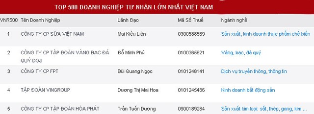 Bên cạnh Bảng xếp hạng 500 doanh nghiệp lớn nhất Việt Nam, Vietnam Report cũng công bố Bảng xếp hạng 500 doanh nghiệp tư nhân lớn nhất Việt Nam. Đây là các doanh nghiệp có vốn sở hữu tư nhân lớn hơn hoặc bằng 51%. Đứng vị trí đầu bảng của danh sách này vẫn là CTCP Sửa Việt Nam (Vinamilk).