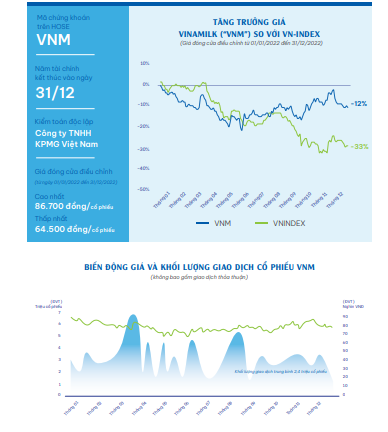 Trên thị trường chứng khoán, cổ phiếu VNM giảm từ mức 80.750 đồng tại thời điểm đầu năm 2022 và tạo đáy 61.300 đồng hồi giữa tháng 6/2022 trước khi phục hồi trở lại và hiện có giá 74.400 đồng/cổ phiếu. Tính chung trong năm 2022, mã VNM chỉ giảm 12% trong khi VN-Index giảm tới 33% và trở thành một trong số cổ phiếu VN30 giảm ít nhất nhóm trong cùng thời điểm.