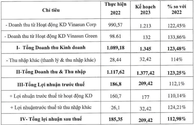 Năm 2023, Vinasun tập trung chủ yếu cho mục tiêu chiến lược là duy trì sự ổn định và phát triển bền vững, gắn chặt tăng cường tái cấu trúc toàn diện Công ty, thực hiện tốt quản trị rủi ro. Theo đó, Công ty phấn đấu kế hoạch tổng doanh thu kinh doanh và thu nhập khác là 1.377,42 tỷ đồng, tăng 23,25% so với thực hiện năm 2022. Tổng lợi nhuận sau thuế là 209,42 tỷ đồng, tăng gần 13% thực hiện năm trước.