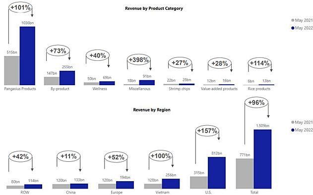Lũy kế 5 tháng đầu năm, Vĩnh Hoàn ghi nhận doanh thu đạt 6.432 tỷ đồng, tăng xấp xỉ 90% so với cùng kỳ.