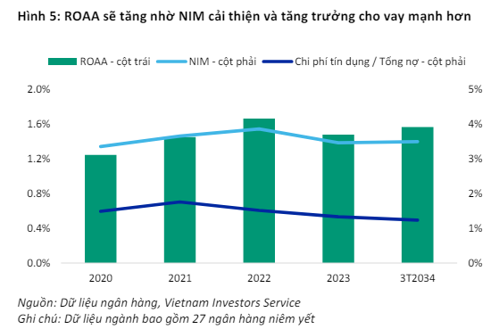 Các chuyên gia của VIS Rating dự báo: “Trong các quý tới, nhu cầu tín dụng sẽ dần tăng và NIM sẽ cải thiện so với mức năm 2023, từ đó thúc đẩy ROAA của các ngân hàng tăng dần”.