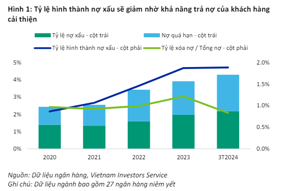“Đến cuối năm 2024, tỷ lệ nợ xấu và chi phí tín dụng của ngành sẽ giảm so với năm trước do tỷ lệ hình thành nợ xấu mới suy giảm và các ngân hàng giải quyết các khoản nợ xấu thông qua việc thu hồi hoặc xóa nợ”, Báo cáo nhận định.