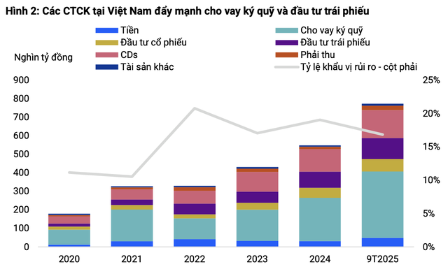 Nhìn trong giai đoạn từ năm 2020 đến 9 tháng đầu năm 2025, tổng tài sản của 30 CTCK lớn nhất ngành có tốc độ tăng trưởng kép hàng năm (CAGR) đạt 34%. Nhiều công ty (thường là các công ty liên kết với ngân hàng tư nhân) đã tích cực cung cấp vốn cho các doanh nghiệp lớn, đặc biệt trong lĩnh vực bất động sản và năng lượng tái tạo, thông qua cho vay trực tiếp, đầu tư trái phiếu và cho vay ký quỹ. Tuy nhiên, những vướng mắc pháp lý gần đây và tình trạng chậm trả trái phiếu của một số doanh nghiệp lớn đã làm gia tăng rủi ro tín dụng.