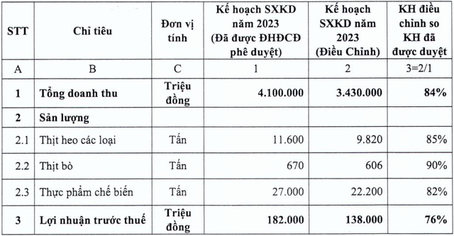 Theo quyết định của ĐHĐCĐ thường niên năm 2023, Vissan đặt mục tiêu tổng doanh thu đạt 4.100 tỷ đồng và lợi nhuận trước thuế đạt 182 tỷ đồng, lần lượt tăng 6% và 5% so với thực hiện năm 2022. Tuy nhiên, theo kế hoạch mới, Công ty điều chỉnh giảm 16% chỉ tiêu tổng doanh thu, xuống còn 3.430 tỷ đồng và giảm 24% chỉ tiêu lợi nhuận trước thuế, xuống còn 138 tỷ đồng.