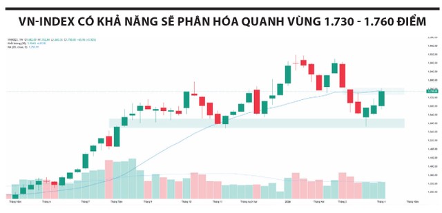 Trong tuần này, VN-Index nhiều khả năng duy trì trạng thái tăng - giảm đan xen và phân hóa quanh vùng cản 1.730 - 1.760 điểm. Khu vực 1.700 điểm sẽ đóng vai trò hỗ trợ gần. Nếu nguồn cung được hấp thụ dần và không gia tăng đột biến, thị trường có cơ sở thiết lập nền tích lũy, qua đó duy trì và mở rộng nhịp hồi phục lên vùng kháng cự cao hơn trên ngưỡng 1.800 điểm. Đồng thời, đây cũng là thời điểm đáo hạn hợp đồng phái sinh tháng 4/2026, do đó nhà đầu tư cần lưu ý khả năng gia tăng biến động trong ngắn hạn.