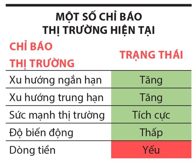 Theo chúng tôi đánh giá, thị trường hiện tại đang có 4/5 chỉ báo quan trọng trong trạng thái tích cực. Việc thỏa mãn càng nhiều tiêu chí thì thị trường càng có xác suất cao để tiếp tục đà tăng ngắn hạn. Tuy nhiên, yếu tố dòng tiền vẫn đang ở trạng thái yếu, điều này đồng nghĩa với xu thế tăng của thị trường sẽ không mạnh và sự lan tỏa không quá rộng, mà diễn biến tích cực mang tính cục bộ ở một vài nhóm ngành có câu chuyện hấp dẫn dòng tiền như đầu tư công, chứng khoán, bất động sản công nghiệp, dầu khí.