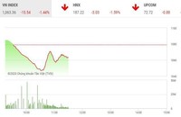 Kết thúc phiên giao dịch sáng ngày 24/12, chỉ số VN-Index giảm 15,54 điểm về 1.063,36 điểm, trong đó độ rộng thị trường nghiêng về những mã giảm điểm. Trên sàn HOSE có 382 mã giảm, 41 mã tham chiếu và chỉ có 59 mã xanh.