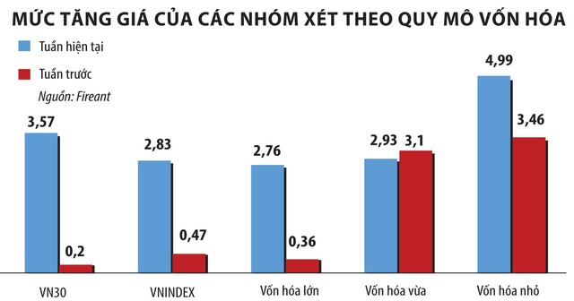 Nhóm cổ phiếu vốn hóa nhỏ có diễn biến giá tốt nhất, với mức tăng 4,99% - ghi nhận tuần giao dịch vượt mức đỉnh ngày 11/6.
