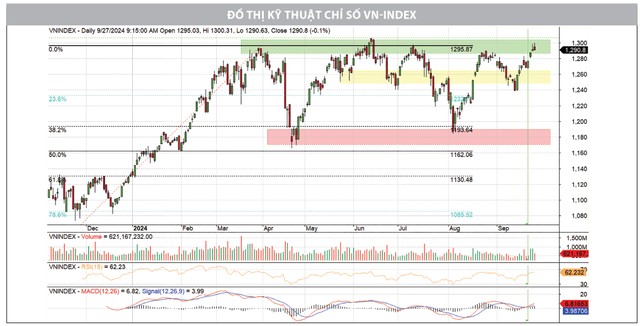Nhìn chung, dòng tiền hồi phục mạnh đi kèm sự đồng thuận của nhóm vốn hóa lớn giúp đà tăng hiện tại có độ tin cậy cao hơn, độ bền vững lớn hơn. VN-Index tiến đến ngưỡng 1.300 điểm, dù xuất hiện rung lắc trong phiên cuối tuần nhưng chưa ảnh hưởng tới xu hướng và được đánh giá là điều chỉnh lành mạnh nhằm tích luỹ, lấy đà để bứt phá. Các vị thế mua mới có thể tích lũy cổ phiếu trong các phiên rung lắc, điều chỉnh của thị trường, nhất là các nhóm cổ phiếu duy trì xu hướng tích cực, kết quả kinh doanh quý III tiếp tục tăng trưởng.