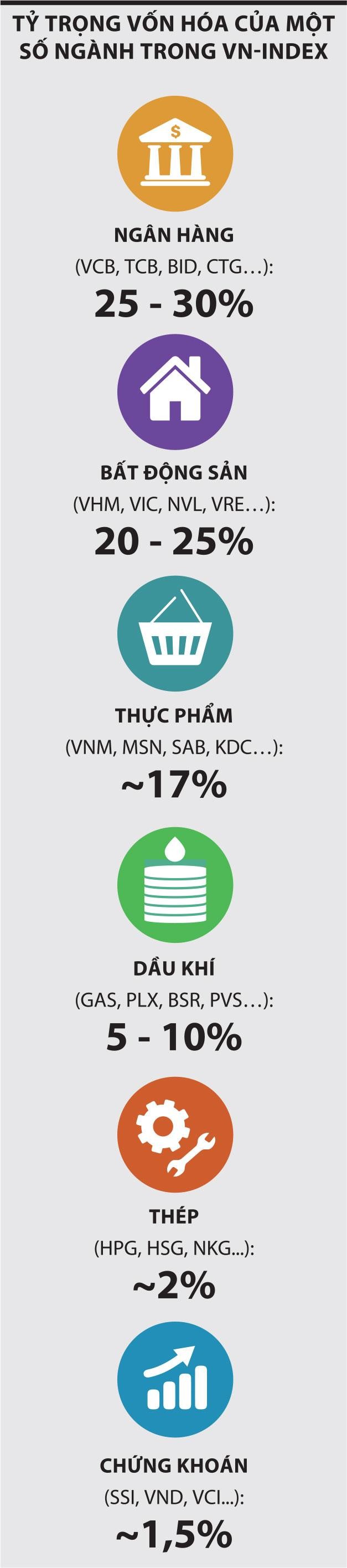 Nhóm bất động sản và thực phẩm cũng có ảnh hưởng không nhỏ lên VN-Index. Nhưng xét về sự ảnh hưởng của cả số liệu và tâm lý, thì nhóm ngân hàng vẫn cho thấy vai trò lớn nhất, dù dòng tiền đầu tư chảy vào đây ít hơn trước.