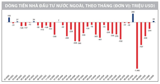 Mặc dù hơn 90% giá trị giao dịch đến từ nhóm nhà đầu tư cá nhân trong nước, nhưng dòng vốn ngoại thường đóng vai trò khởi phát và định hướng cho các xu hướng lớn. Việc khối ngoại quay trở lại mua ròng hơn 2.000 tỷ đồng trong tháng cuối năm 2025 là tín hiệu đáng chú ý, đặc biệt khi nhịp tăng mạnh của thị trường trong năm qua cũng bắt đầu sau giai đoạn mua ròng hơn 7.000 tỷ đồng trong các tháng 6-7.