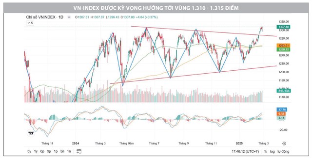 Dù vậy, vùng 1.310 - 1.315 điểm là một mức kháng cự ngắn hạn, trong khi các chỉ báo kỹ thuật ngắn hạn cho thấy thị trường bước vào trạng thái quá mua. Do đó, các nhịp rung lắc có thể xuất hiện, nhưng cũng là cơ hội cho các nhà đầu tư chậm chân khi chưa mua đủ khi thị trường đang tích lũy.