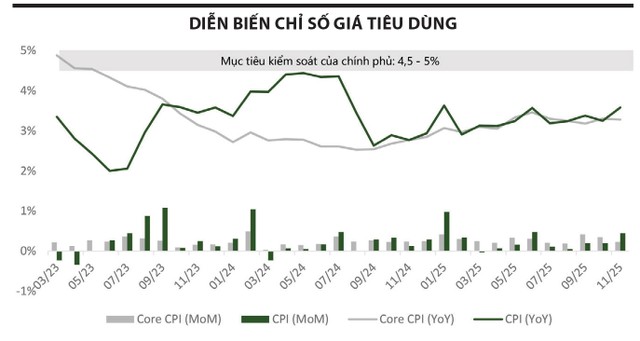 Lạm phát năm 2025 được duy trì dưới ngưỡng mục tiêu kiểm soát, dù đã xuất hiện dấu hiệu nhích nhẹ trong những tháng cuối năm. Bình quân 10 tháng, chỉ số CPI tăng 3,29% so với cùng kỳ, thấp hơn đáng kể so với mục tiêu điều hành 4,5-5%, cho thấy áp lực giá nhìn chung vẫn nằm trong tầm kiểm soát của nhà điều hành. Riêng tháng 11/2025, CPI ghi nhận mức tăng 0,45% so với tháng 10 và tăng 3,58% so với cùng kỳ, chủ yếu đến từ các yếu tố mang tính ngắn hạn sau giai đoạn bão lũ kéo dài.