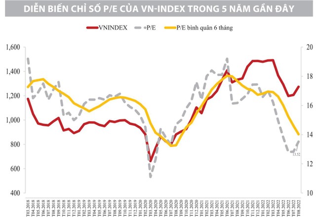VN-Index ghi nhận mức P/E 13,5 lần vào ngày 18/08/2022, tiến lên sát mức P/E bình quân 6 tháng quanh 14 lần. Như vậy, chỉ số có thể gặp khó khăn tại vùng kháng cự 1.310 - 1.320 điểm.