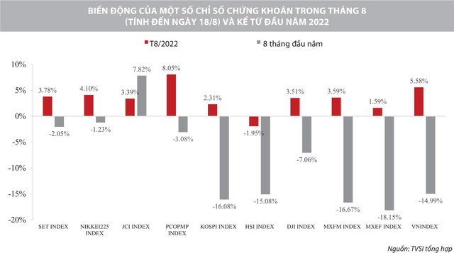 Tuy nhiên, từ đầu tháng 8 đến ngày 18/8, VN-Index là một trong các chỉ số tăng điểm tốt nhất khu vực Đông Nam Á và mức tăng cũng vượt trội so với chỉ số các thị trường cận biên hay mới nổi.
