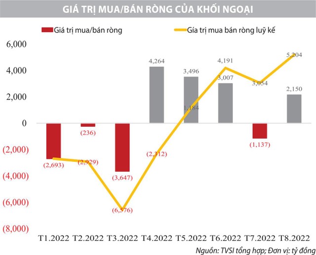 Khối ngoại sau khi bán ròng 1.137 tỷ đồng trong tháng 7 đã mua ròng trở lại trong nửa đầu tháng 8, với mức mua ròng 2.150 tỷ đồng, tập trung vào các mã SSI, HPG, HDB (ngược lại, VNM, BSR, chứng chỉ quỹ FUEVFVND là các mã bị bán ròng nhiều nhất). Lũy kế kể từ đầu năm 2022, khối ngoại mua ròng 5.204 tỷ đồng.