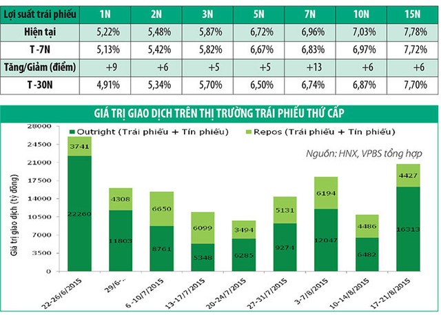Thị trường trái phiếu thứ cấp tuần từ 17 - 21/8 có sự khởi sắc trở lại khi tổng giá trị giao dịch đạt 20.740 tỷ đồng, tăng 89% so với tuần trước đó và là giá trị cao nhất trong 7 tuần gần đây.