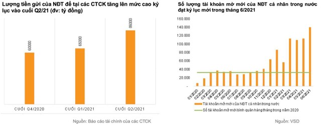 Mặc dù thanh khoản giảm trong tháng 7/2021, VNDIRECT vẫn chưa nhìn thấy dấu hiệu dòng tiền bị rút ra khỏi thị trường. Lượng tiền gửi của nhà đầu tư để tại các công ty chứng khoán cuối quý II/2021 đạt 86.000 tỷ đồng, tăng 32,3% so với thời điểm cuối quý I/2021. Điều này cho thấy nhà đầu tư luôn chực chờ gia nhập thị trường một khi cơ hội xuất hiện.