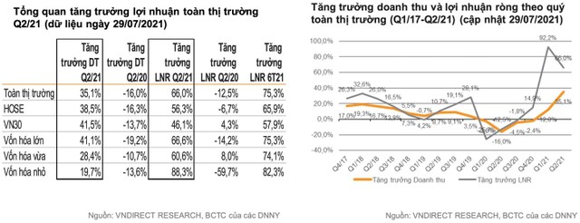 Thứ hai, doanh nghiệp niêm yết duy trì kết quả kinh doanh quý II/2021 tích cực. Đến ngày 2/8/2021, 700 công ty đã công bố kết quả kinh doanh quý 2/2021, tương ứng gần 40% tổng số cổ phiếu và 85% tổng vốn hóa toàn thị trường. Theo ước tính của VNDIRECT, lợi nhuận ròng của các doanh nghiệp niêm yết trên cả 3 sàn (HOSE, HNX, UPCoM) tăng 66,0% so với cùng kỳ từ mức thấp của quý II/2020 (lợi nhuận ròng giảm 12,5% so với cùng kỳ).