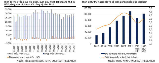 Thứ hai, lạm phát trong nước có thể tăng từ cuối quý III/2023. Tuy vậy, tỷ giá VND năm nay sẽ được hỗ trợ tốt hơn so với nửa cuối năm 2022 bởi thặng dư thương mại duy trì mức cao (7 tháng đầu năm 2023 Việt Nam xuất siêu 16,5 tỷ USD, gấp hơn 12 lần cùng kỳ năm 2022). Bên cạnh đó, FDI và kiều hối ổn định. Đồng thời, các thỏa thuận bán cổ phần cho nhà đầu tư nước ngoài dự kiến thực hiện trong nửa cuối năm 2023 sẽ làm tăng nguồn cung ngoại tệ.