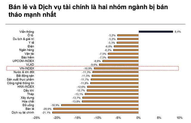 Nhóm ngành bán lẻ và dịch vụ tài chính bị bán mạnh nhất trong tháng 10 do kỳ vọng kinh tế phục hồi trong quý III bị lung lay dữ dội từ Fed cam kết giữ lãi suất điều hành ở vùng cao và thị trường bất động sản Trung Quốc gặp nhiều khó khăn. Bên cạnh đó, sau khi ra kết quả GDP Việt Nam 9 tháng năm 2023 đạt 4,2%, nhóm cổ phiếu hưởng lợi từ sự hồi phục kinh tế như bán lẻ, xây dựng và thép gặp áp lực bán mạnh. Cổ phiếu nhóm dịch vụ tài chính cũng bị bán tháo mạnh sau diễn biến tiêu cực của thị trường chứng khoán gần đây.