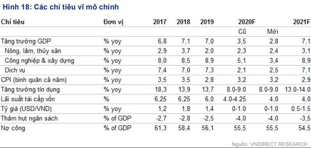 Do tăng trưởng GDP quý III/2020 thấp hơn kỳ vọng của VNDIRECT và lĩnh vực công nghiệp phải đối mặt với những khó khăn lớn hơn do tác động của làn sóng COVID-19 thứ hai trên thế giới, VNDIRECT điều chỉnh dự báo tăng trưởng GDP năm 2020 xuống 2,8% trong kịch bản cơ sở (từ mức 3,5% trước đó).