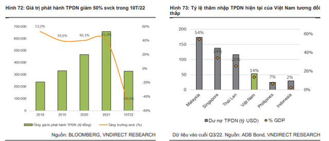 Trong Báo cáo Chiến lược đầu 2023: Đầu tư có trách nhiệm - Xây tương lai vững bền, VNDirect đánh giá, thị trường trái phiếu doanh nghiệp Việt Nam bùng nổ trong giai đoạn 2020 - 2021, tuy nhiên những rủi ro đầu tư và pháp lý đã bộc lộ qua một số sai phạm xảy ra đầu năm 2022.