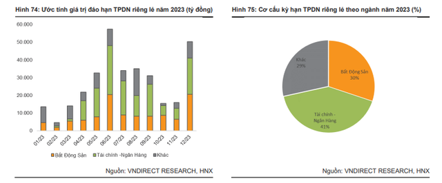 Mặt khác, tổng giá trị trái phiếu riêng lẻ đáo hạn năm 2023 vào khoảng 300.000 tỷ đồng (tăng 90% so với cùng kỳ). Trong đó, bất động sản và tài chính - ngân hàng lần lượt chiếm 30% và 40%. Trong bối cảnh chính sách tiền tệ thắt chặt, chi phí tài chính gia tăng và thắt chặt phát hành trái phiếu, một số tổ chức phát hành có ít cơ hội tiếp cận nguồn vốn nhằm tái cơ cấu tài chính và đáp ứng nghĩa vụ nợ ngắn hạn.