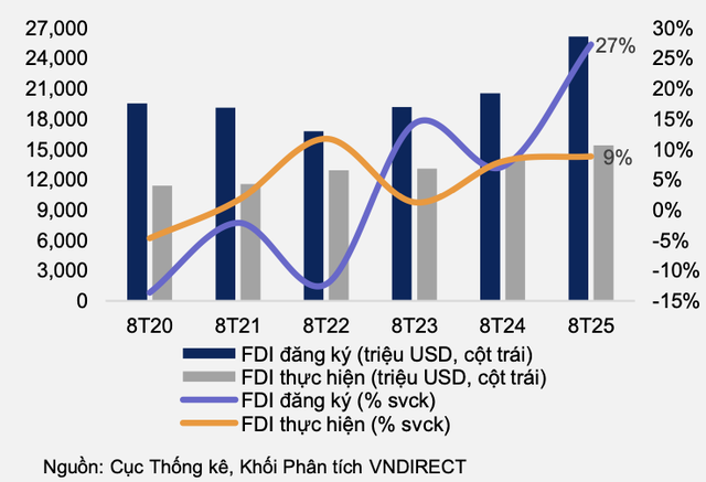 Điều kiện tín dụng toàn cầu nới lỏng và lãi suất Mỹ giảm cũng tạo thuận lợi cho dòng vốn FDI. Việt Nam nổi lên như điểm đến hấp dẫn nhờ đa dạng hóa chuỗi cung ứng, lợi thế địa lý, định hướng xuất khẩu cùng với hạ tầng logistics đang phát triển. Bên cạnh đó, lực lượng lao động có tay nghề và chi phí cạnh tranh, cùng với thị trường xuất khẩu rộng hơn nhờ các hiệp định thương mại thế hệ mới, là những yếu tố nâng triển vọng FDI.