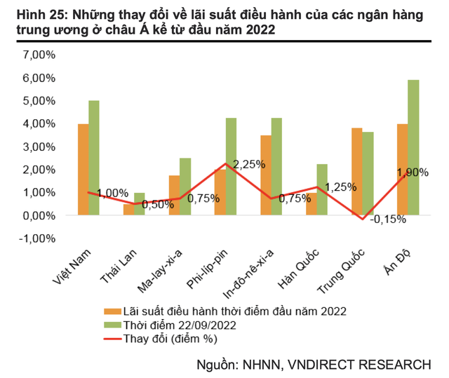 Sau lần tăng lãi suất gần nhất của Cục Dự trữ Liên bang Mỹ (Fed), Ngân hàng Nhà nước Việt Nam đã quyết định tăng lãi suất điều hành thêm 100 điểm cơ bản, có hiệu lực từ ngày 23/9/2022. VNDIRECT đánh giá hành động trên của Ngân hàng Nhà nước Việt Nam là tương đối quyết liệt và kịp thời nhằm hỗ trợ tỷ giá VND và kiềm chế lạm phát. Tính từ đầu năm 2022, mức tăng lãi suất điều hành của Việt Nam đã cao hơn một chút so với một số quốc gia trong khu vực Đông Nam Á.