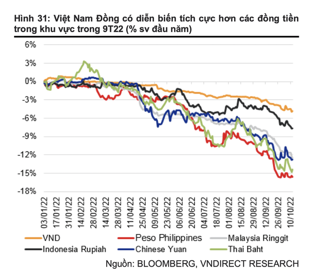 Tuy nhiên, VNDIRECT cho rằng, so với các đồng tiền trong khu vực, tiền đồng vẫn là đồng tiền ổn định nhất. Kể từ đầu năm 2022 (dữ liệu tính đến ngày 17 tháng 10 năm 2022), hầu hết các đồng tiền trong khu vực đã giảm hơn 8% so với USD, bao gồm Peso Philippine (-15,7% so với USD), Baht Thái Lan (-14,8% so với USD), Nhân dân tệ của Trung Quốc (-13,4% so với USD), Ringgit Malaysia (-13,2% so với USD) và Rupiah Indonesia (-8,6% so với USD).