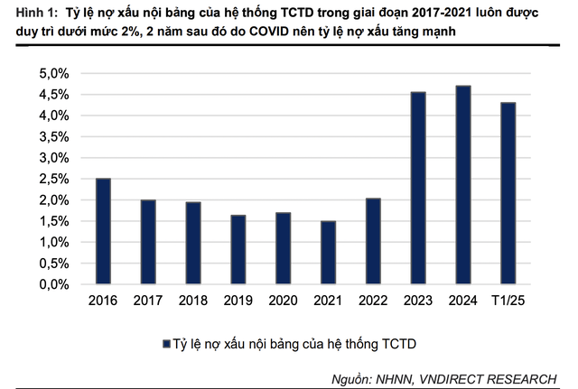 Cũng theo VNDirect, việc luật hóa ba điều khoản trong Nghị quyết 42 sẽ giúp giảm tỷ lệ nợ xấu ngành ngân hàng xuống dưới 3%. Tính đến tháng 1/2025, tỷ lệ nợ xấu nội bảng toàn ngành ở mức 4,3%, tập trung tại một số ngân hàng yếu kém và diện kiểm soát đặc biệt.