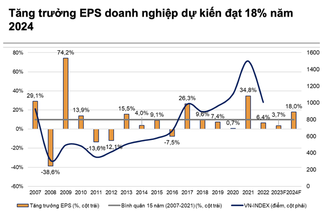 Nhóm phân tích dự báo EPS toàn thị trường sẽ tăng trưởng 3,7% năm 2023 và 18,0% năm 2024. EPS tăng trưởng năm 2024 được cải thiện đáng kể nhờ 4 yếu tố.